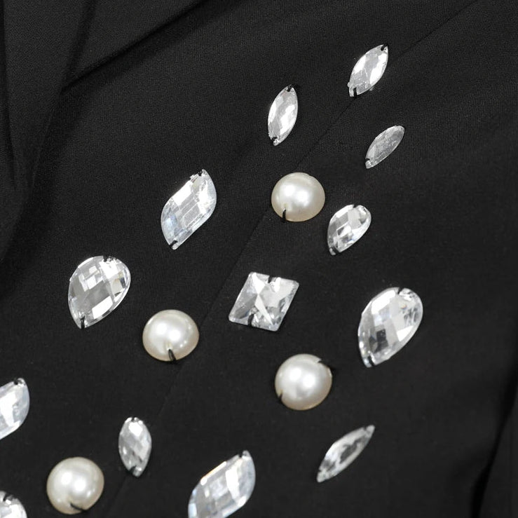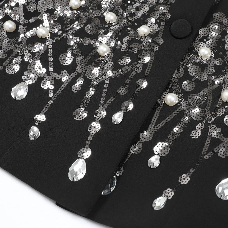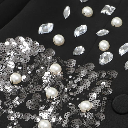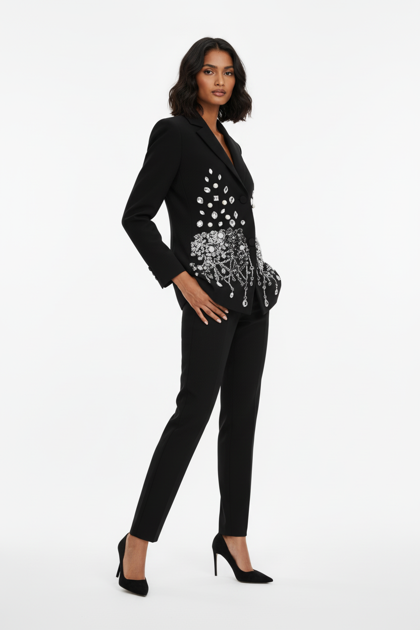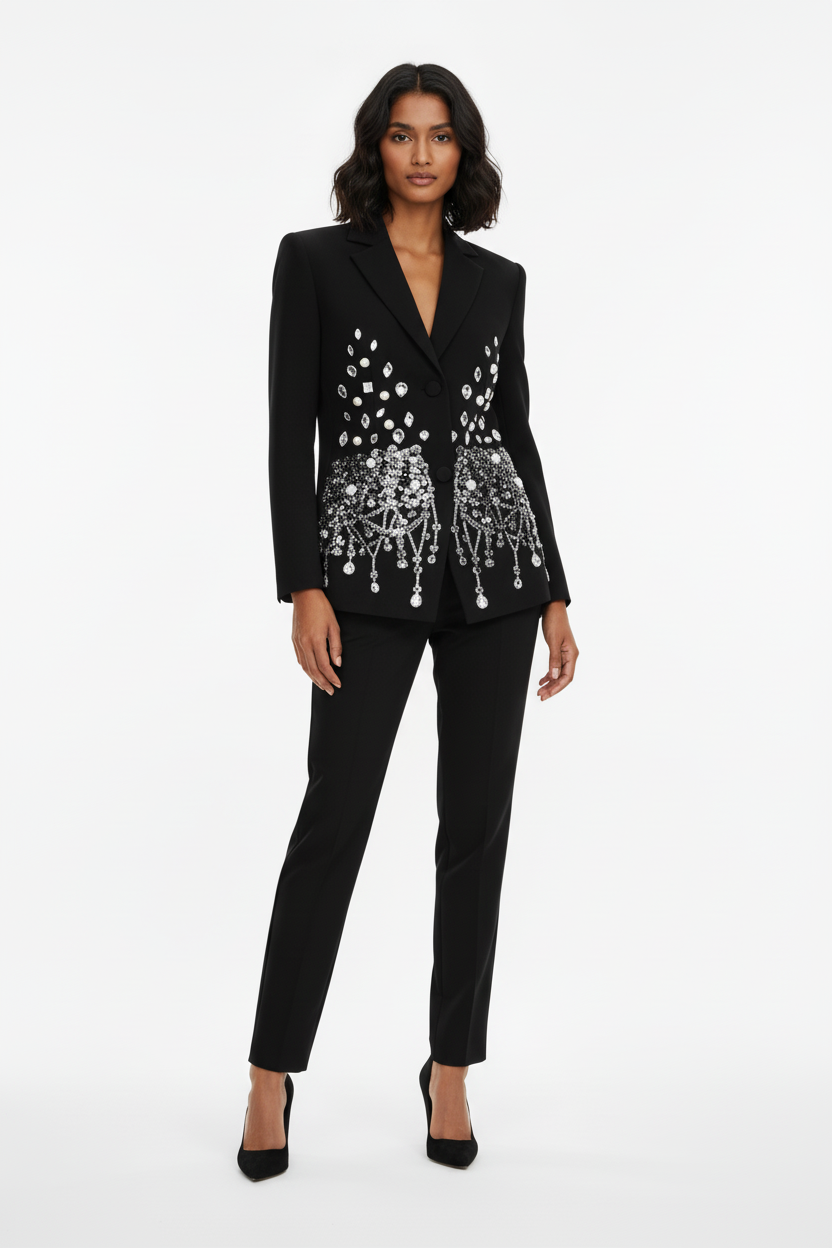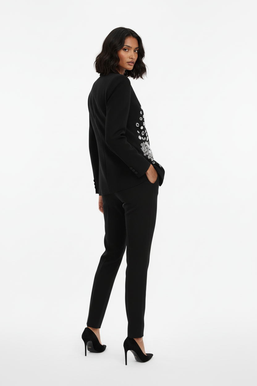 De Sculpted Silhouette Blazer is ontworpen om het lichaam optisch te vormen. De rijke versiering is bewust geconcentreerd rond de heupen, wat zorgt voor diepte en balans, terwijl de details richting de taille verfijnen en versmallen. Dit creëert een elegant zandloper-effect zonder strakke snit.