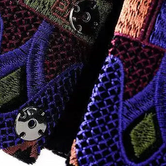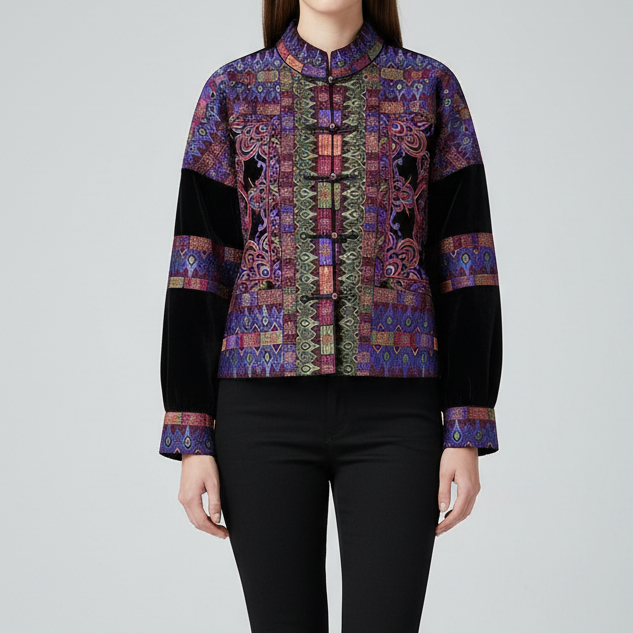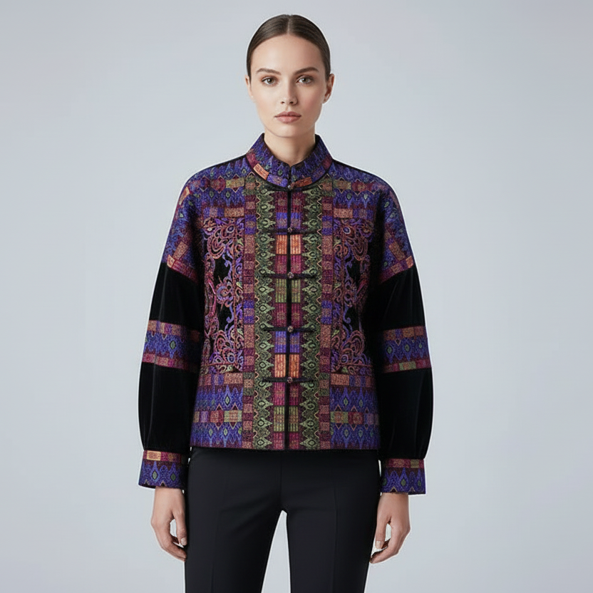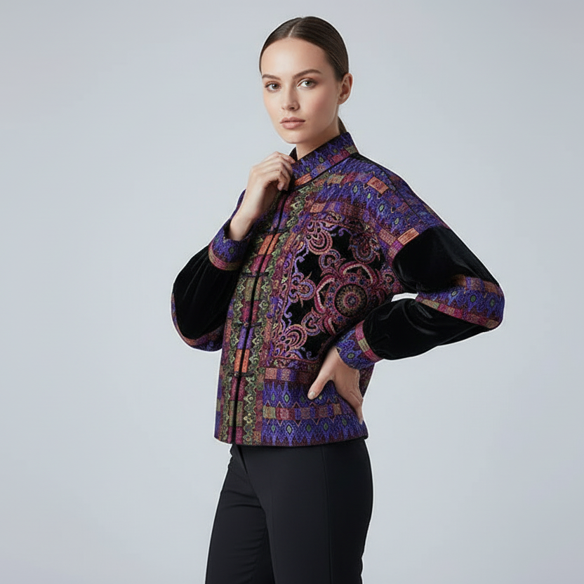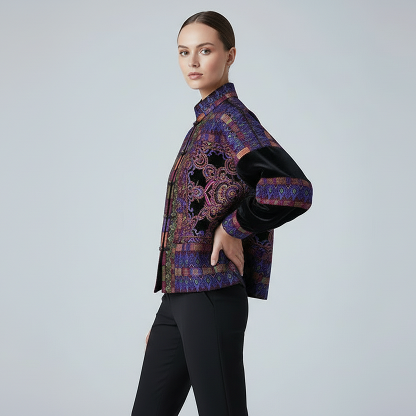 Deze exclusieve velours jas valt direct op door haar diepe kleurtonen en volledig gedetailleerd borduurwerk. De combinatie van zachte velours en verfijnde patronen geeft de jas een luxe uitstraling met een subtiele paleis-geïnspireerde sfeer. Een bijzonder stuk voor wie kwaliteit, rijke textuur en afwerking waardeert. Ontworpen voor wie houdt van karaktervolle details.