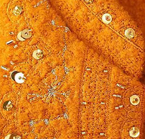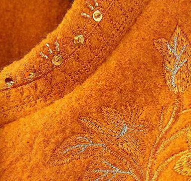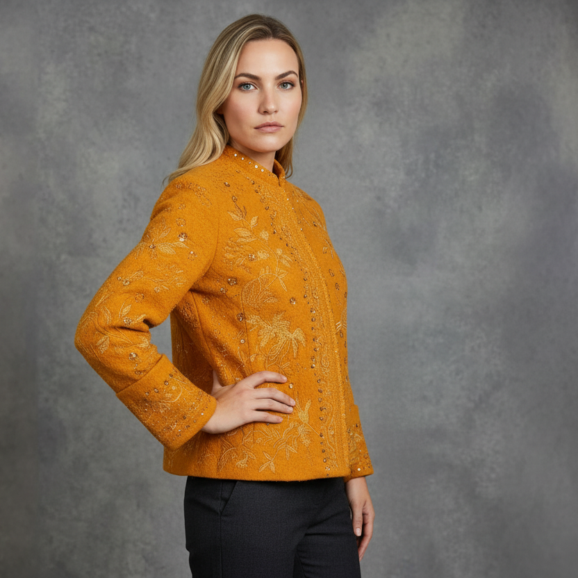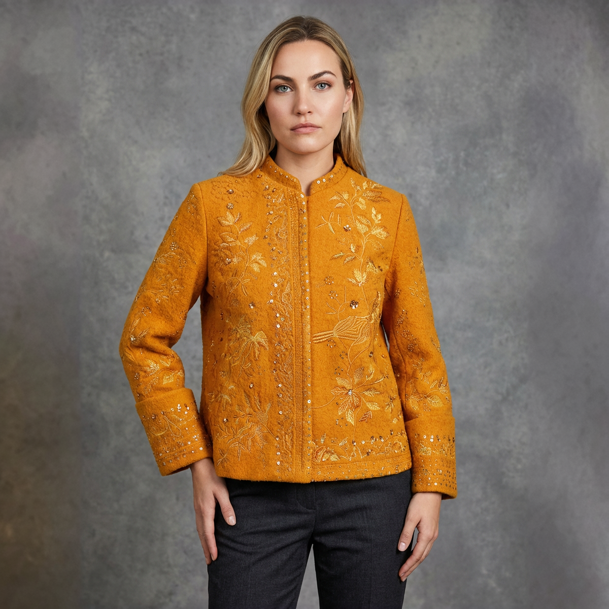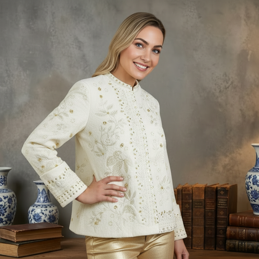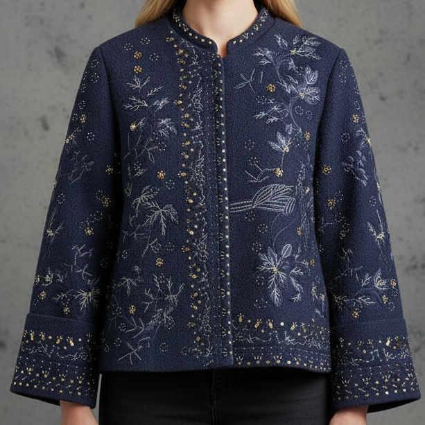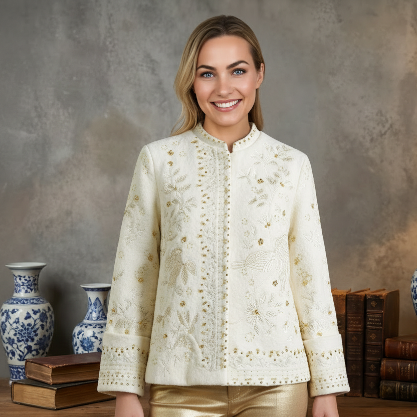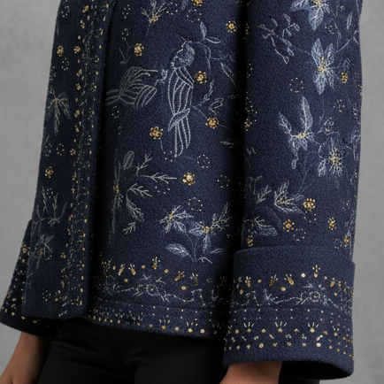 Het oppervlak is verfijnd afgewerkt met ingewerkt borduurwerk, verrijkt met kralen- en paillettendetails die subtiel cloud sheep reliëf creëren. Dit geeft diepte aan het ontwerp zonder te overheersen. De combinatie van structuur en decoratie maakt deze jas bijzonder geschikt voor wie houdt van uitgesproken maar draagbare mode.